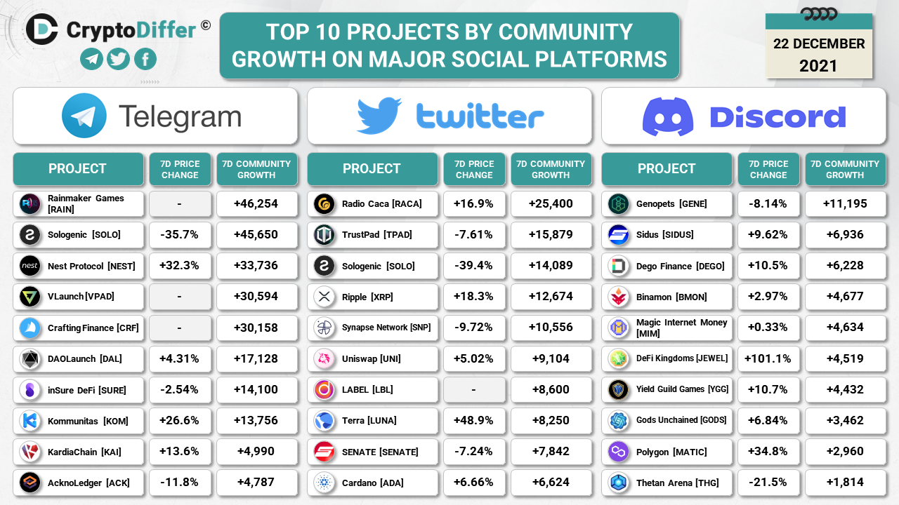 TOP 10 PROJECTS BY COMMUNITY GROWTH ON MAJOR SOCIAL PLATFORMS IN THE LAST 7 DAYS
