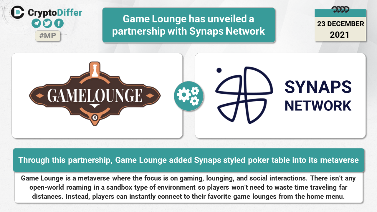 Game Lounge is a metaverse where the focus is on gaming, lounging, and social interactions. Through this partnership, Game Lounge added Synaps Network styled poker table into its metaverse.