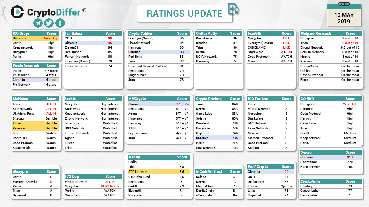 Ian Balina: COTI 98, Chromapolis 95, Eleven01 94, Resistance 85, Ferrum Network 80, Evernym 79, Elrond Network 74