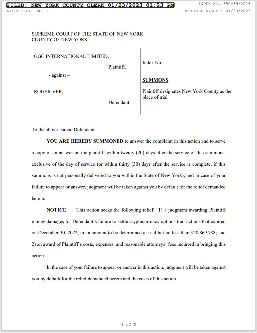 🚨 Банкротящийся Genesis вызывает в суд легендарного Роджера Вера (одного из главных пропагандистов биткоин-форка Bitcoin Cash) за неуплату $20 млн по криптовалютным опционам