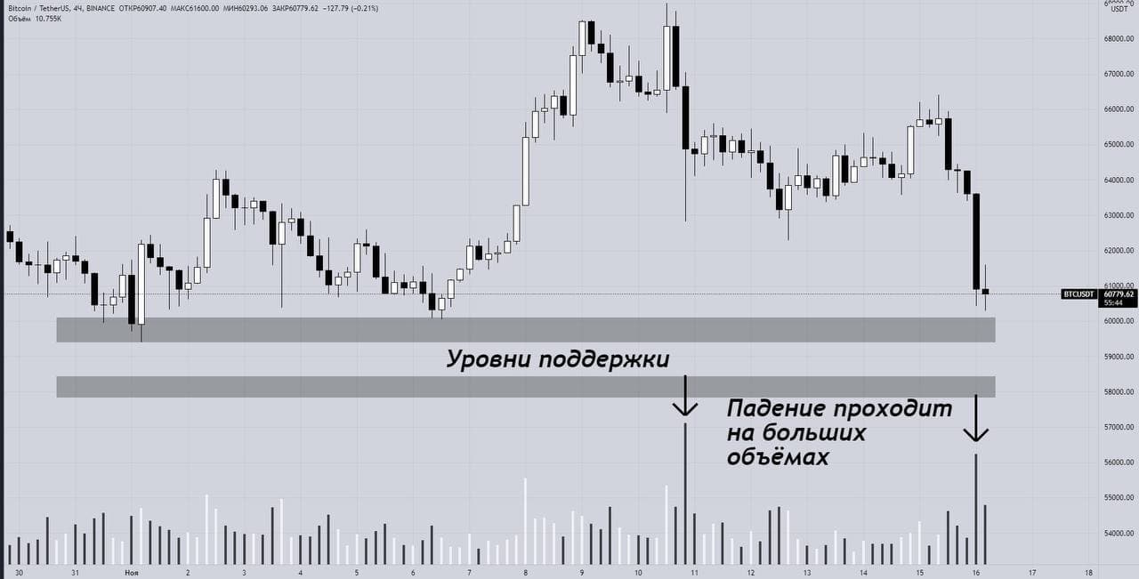 ⚡️На 4-х часовом таймфрейме сразу бросается в глаза то, что падение проходит на больших объёмах (отметил данный факт на графике). Данный факт свидетельствует о силе медведей, поэтому нельзя утверждать, что коррекция завершена.