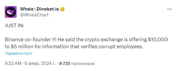 🫵 Соучредитель Binance Йи Хэ сообщила, что криптовалютная биржа предлагает от $10 000 до $5 млн за информацию, подтверждающую коррумпированность сотрудников.