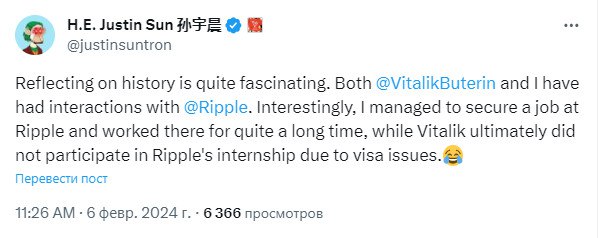 😃 Джастин Сан рассказал о том, что он и Виталик Бутерин пробовали в свое время стажироваться в Ripple.