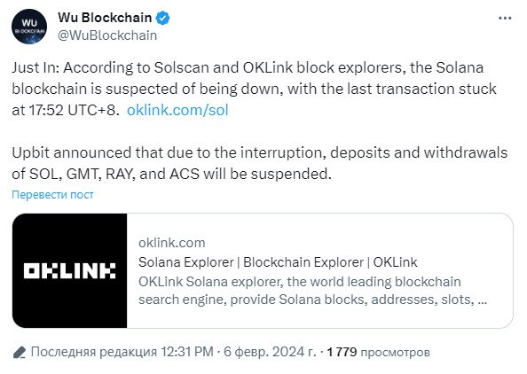 🥺 По данным эксплореров Solscan и OKLink, блокчейн Solana временно неработоспособен, а последняя транзакция зависла в 17:52 UTC+8.