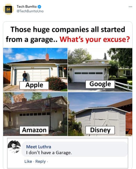 🤣 — Эти крупные компании начинали в гараже! Какие у тебя могут быть оправдания?!