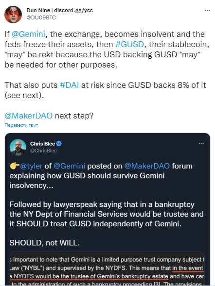 🤔 "Если биржа Gemini станет неплатежеспособной и федералы заморозят ее активы, то GUSD (стейблкоин Gemini), *может* ректануться, потому что доллары, которыми обеспечивается поддержка GUSD, *может* понадобиться для других целей.
