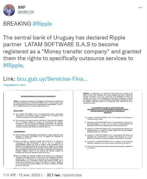 ⚡️Центральный банк Уругвая объявил партнера Ripple, LATAM SOFTWARE SAS, зарегистрированным как «компания по денежным переводам», предоставив ей права на аутсорсинг услуг Ripple
