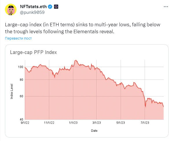📉 Индекс крупнокапитализированных NFT-коллекций (в ETH-эквиваленте) опустился до многолетних минимумов, даже ниже минимальных уровней, которые наблюдались после выхода Elementals.
