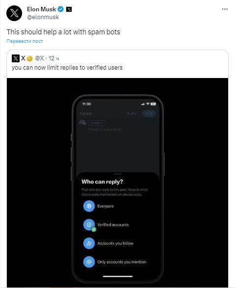 🤖 Илон Маск продолжает бороться с ботами в реплаях
