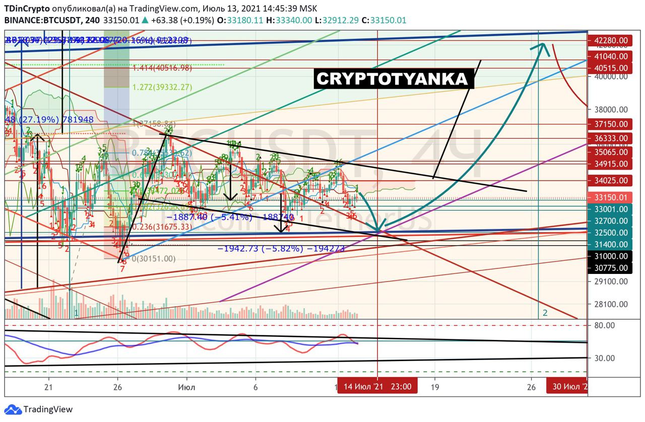 всё то же самое, ждём сначала 31000-31400 и затем выход вверх на пробой бычьего флага (чёрным), цель по флагу 41000 и если учитывать почти двухмесячный торговый диапазон, то это выход на 42300, верхний край синего пологого канала, там посмотрим