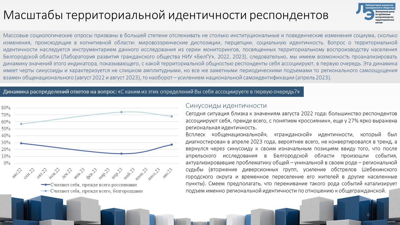 📍Динамика ответов на данный вопрос показывает плавный рост региональной идентичности в Белгородской области в ущерб общероссийской с начала СВО и до весны 2023 года. После этого ситуация вернулась к значениям весны 2022 года. Возможно, такая динамика была обусловлена процессами дезадаптации и последующей адаптации белгородцев к стремительному росту военно-террористических угроз. В этих условиях жители приграничного региона стали особенно остро ощущать собственную «особость», в какой-то мере даже – оторванность от остальной России. В последующем же объем и характер угроз перестал осознаваться как нечто особенное, уникальное для региона, поскольку им оказалась подверженной значительная часть страны.
