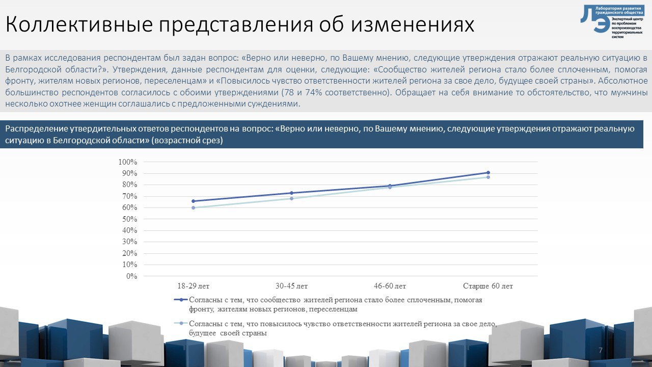 📍Вместе с тем, интерпретируя полученные данные, необходимо иметь в виду, что мы имеем дело с очень чувствительной и ценностно окрашенной для респондентов проблематикой, следствием чего может быть значительная доля социально одобряемых ответов. Также обращает на себя внимание существенная разница в оценках представителей разных возрастных групп. Для молодежи рост сплоченности и ответственности в региональном сообществе не столь очевиден, как для представителей старших поколений.