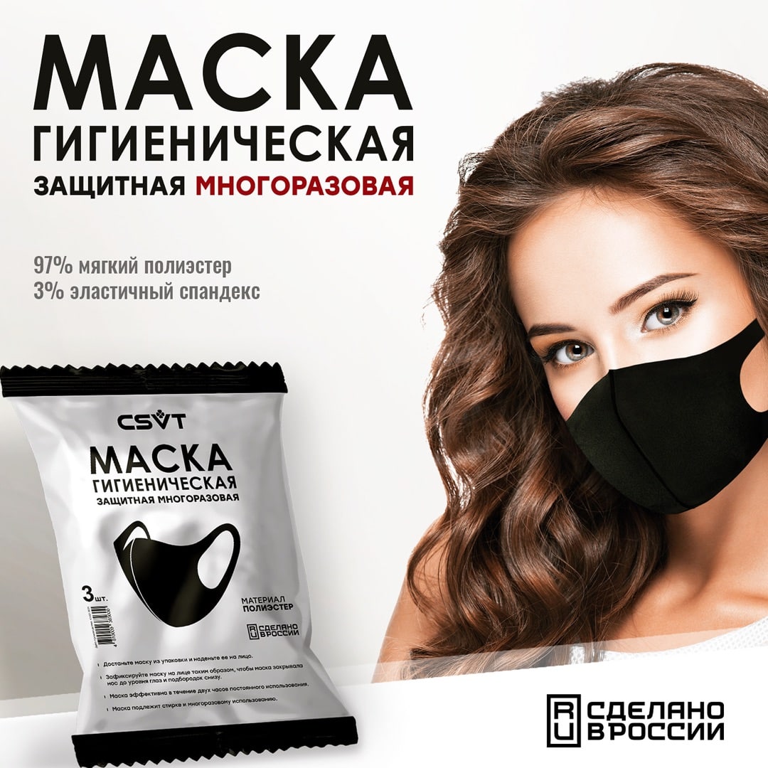 Маски черные гигиенические защитные CSVT гипоаллергенны и обладают высоким уровнем бактериальной фильтрации. Черный цвет не вызывает ассоциации с медициной и позволяет комбинировать маску с повседневным стилем одежды.