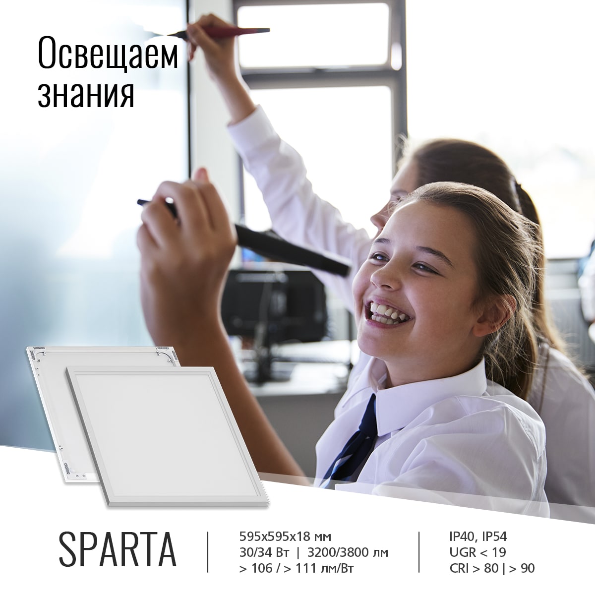 Светодиодные панели с торцевой засветкой и со встроенным LED-драйвером SPARTA (595х595х18) соответствуют всем требованиям и нормам к освещению школ, обеспечивая классы, лаборатории, коридоры необходимыми условиями для учебного процесса.