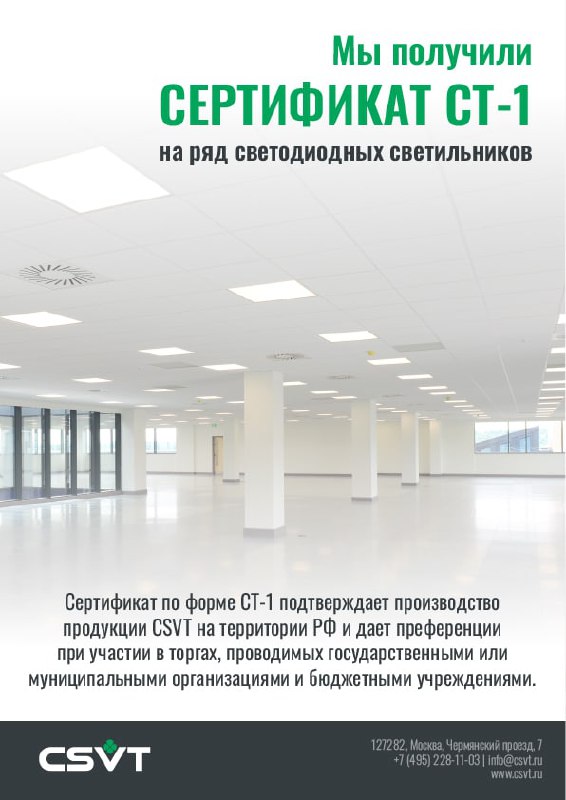 Компания CSVT получила сертификат СТ-1 на ряд светодиодных светильников. Это важный шаг в реализации программы импортозамещения и развития светотехнического рынка России.