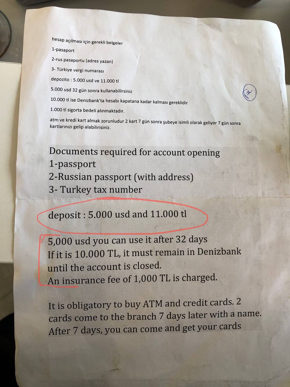 Но все-таки, справедливости ради, стоит отметить, что «русский» вопрос тут все же стоит. Стамбул. Зашел в Denisbank (бывшая дочка Сбера) открыть счет для оплаты всяких штук. Администратор зала спрашивает «Рашн?» и протягивает этот вялый листок с условиями открытия счета (см. ниже). Пока читаю, за моей спиной раздается возглас администратору, он что-то отвечает, говорит мне «Сорри», берет листок, зачеркивает 11.000 tl и надписывает 22.000 tl.