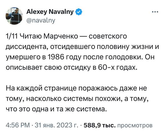 Анатолий Марченко – писатель, рассказавший миру о брежневских и постбрежневских лагерях, и замученный насмерть в Чистопольской тюрьме. Навального привлекала стойкость и бескомпромиссность Марченко.