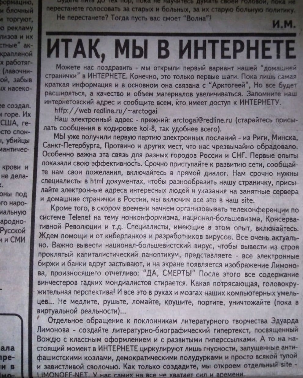 Ниже - не первый номер газеты, а номер, который оглашал, что нацболы, о ужас, таки вышли в интернет. "Лимонка" №50. Октябрь 1996. Присылайте сообщения в кодировке koi-8.