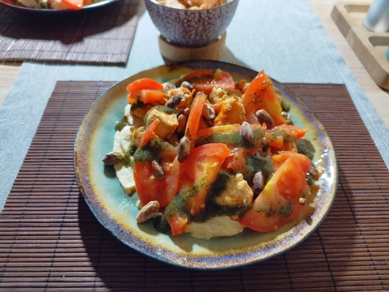 Пока птичечка радуется на сковородке, нарезаем мелкими кубиками помидоры и достаем наш самый главный ингредиент — хумус. Его просто равномерно размазываем по тарелке средним слоем. Когда индейка пожарится — выкладываем её на тарелку, поверх хумуса.