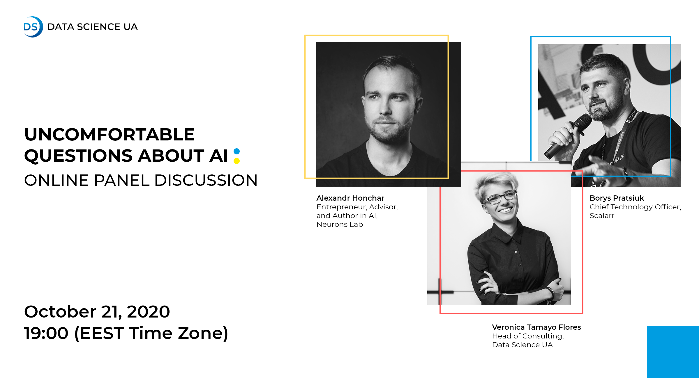 On October 21 Data Science UA invites you to participate in the intriguing Online Panel discussion “Uncomfortable Questions About AI”.