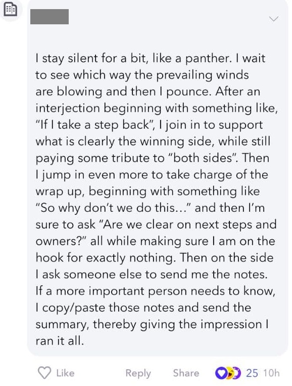 Я тут заскриншотила комментарий на Fishbowl (приложение для трепа на около-профессиональные темы), который наглядно иллюстрирует, в чем разница между корпоративной культурой "игра на результат" и корпоративной культурой "игра на публику".