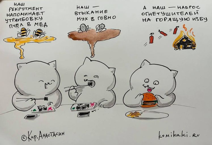 Понятно, что я такая дерзкая потому, что теперь нахожусь с другой стороны баррикад, но вот что я хочу сказать - процесс найма в большинстве компаний, особенно тех, куда приходит много кандидатов, крайне хаотично организован. Отказ просто потому, что в вакансии забыли что-то указать, но это нужно - бывает очень часто. Отказ потому, что кто-то согласился на интервью быстрее или был рекомендован текущим сотрудником, поэтому ему отдали предпочтение - обычное дело. Отказ, когда в течение нескольких дней кандидат не отвечает на письмо - бывает. И самое обидное - отказ тогда, когда резюме даже не просмотрено, человек просто подался не в тот момент или некому просматривать весь пайплайн, глянули 10 кандидатур и выбрали - тоже очень ходовой случай.