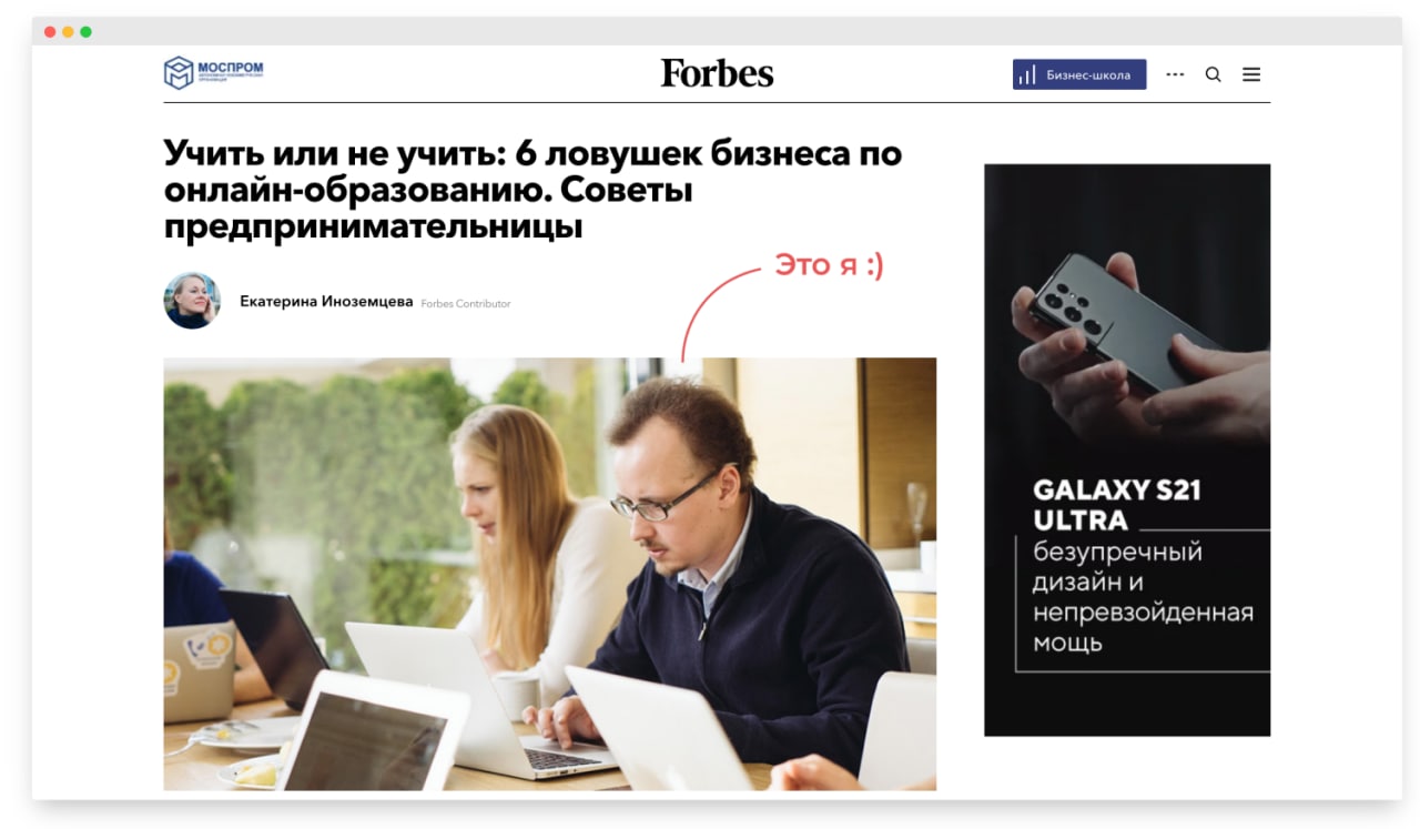 (На скрине ниже: одна из публикаций эксперта нашей школы в Forbes, с фоткой, на которой у меня особо серьезный вид 😅)