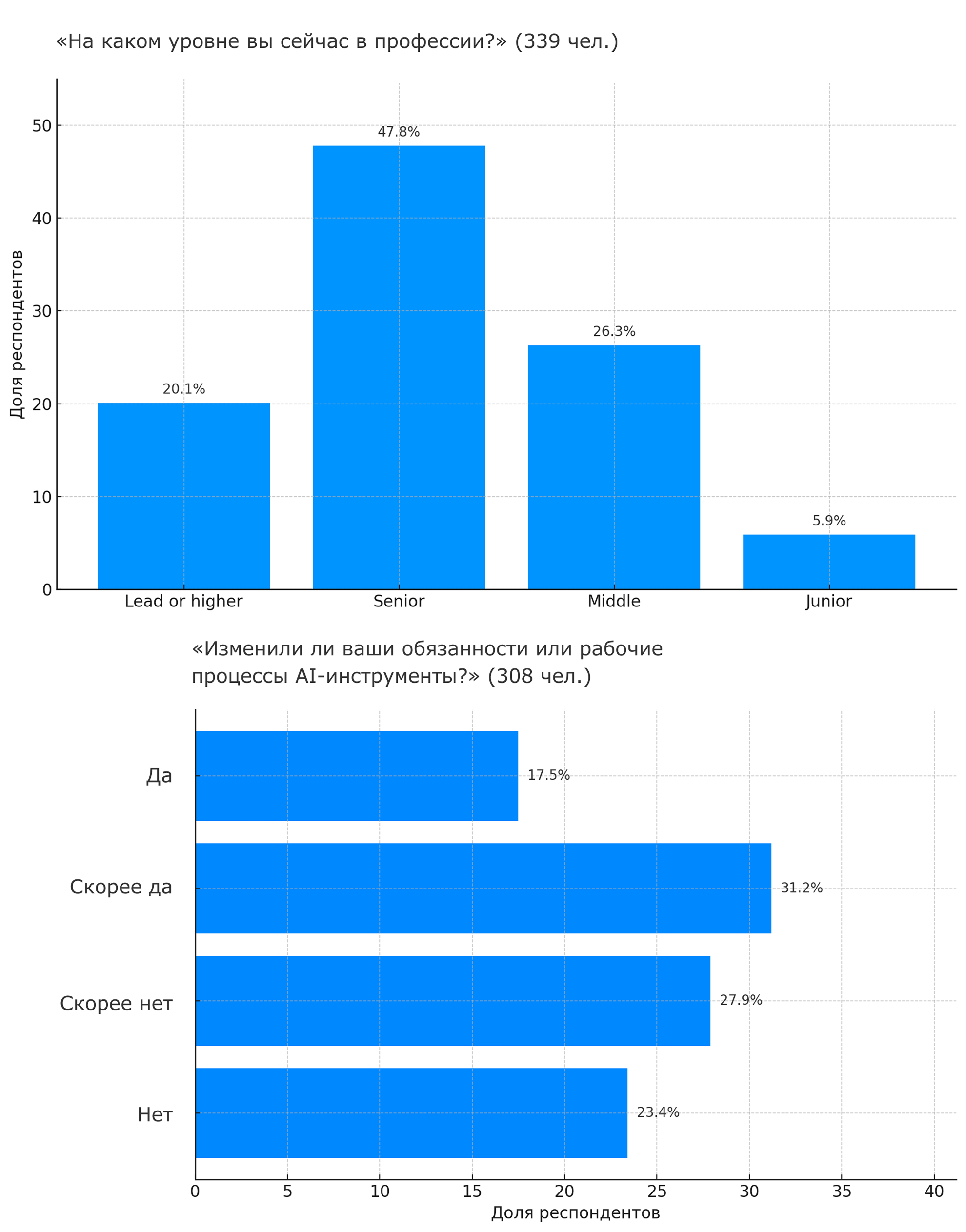 • 77% не видят в ИИ прямой угрозы и воспринимают его как помощника, а не конкурента. 49% активно внедряют ИИ в процессы