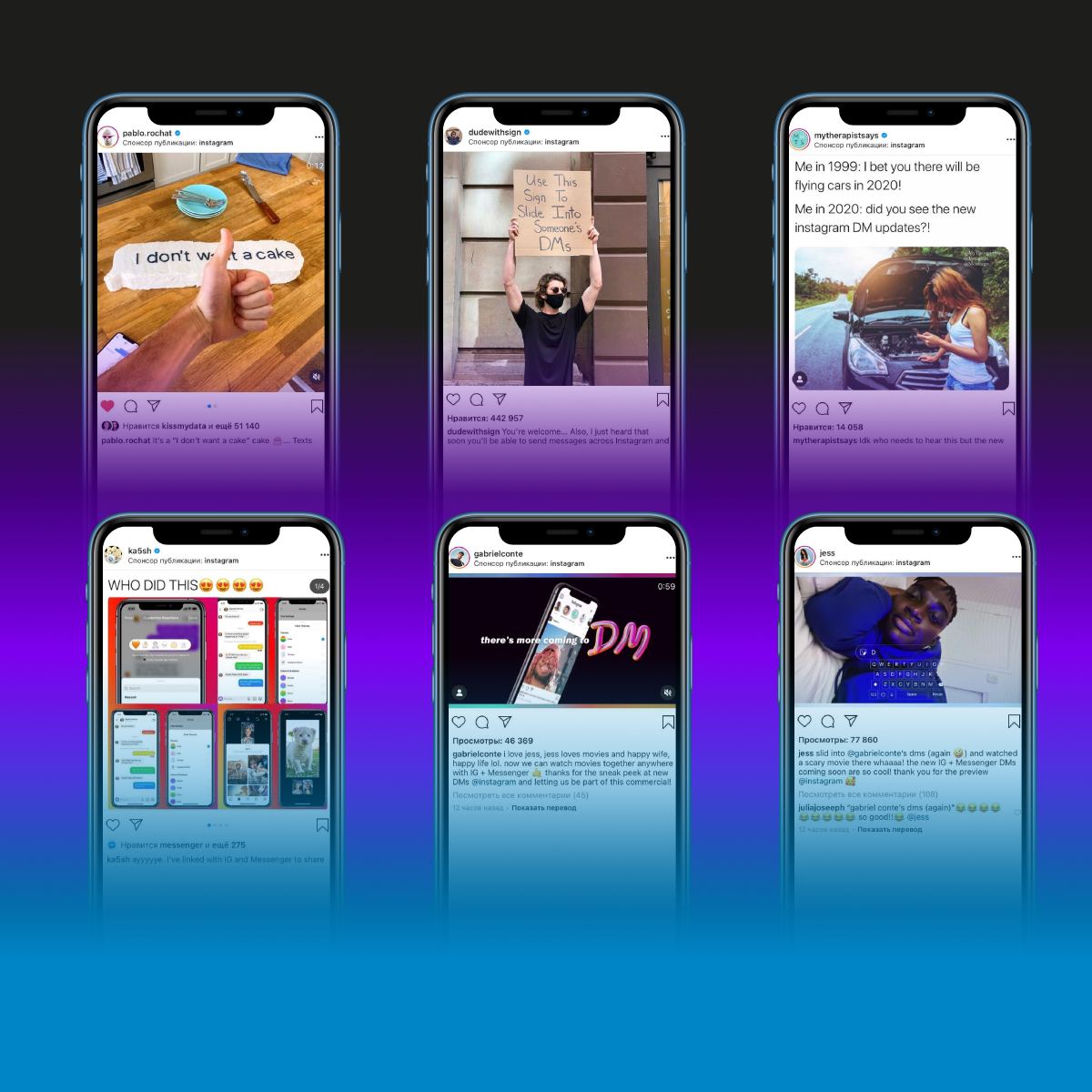 Интересно, каким образом инстаграм продвигает это нововведение. Помимо статьи в блоге, информация об обновлении мессенджера появилась на страницах инфлюенсеров разной величины. Одни просто участвовали в съемках рекламного ролика и разместили его у себя на странице, а другие креативно анонсировали новинки. Так, например, у @pablo.rochat появился пост с тортом в виде реплики из мессенджера, а у знаменитого парня с табличкой — характерный для него пост.