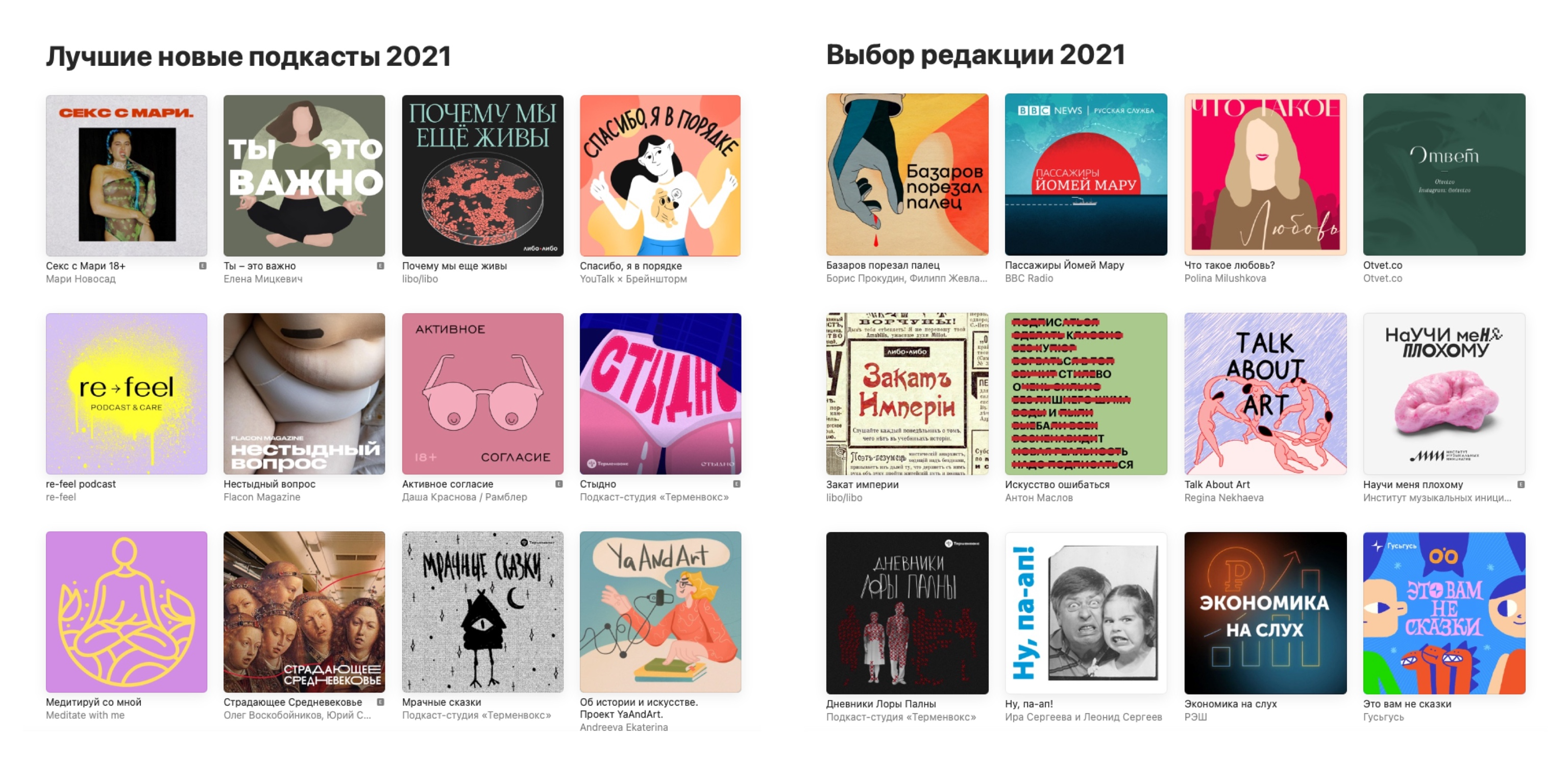 Редакция Apple Podcasts представила топ русскоязычных подкастов за 2021. Все шоу разделили на две подборки: «Выбор редакции» и «Лучшие новые подкасты». В каждой из них — по 12 подкастов от студий, брендов и блогеров.