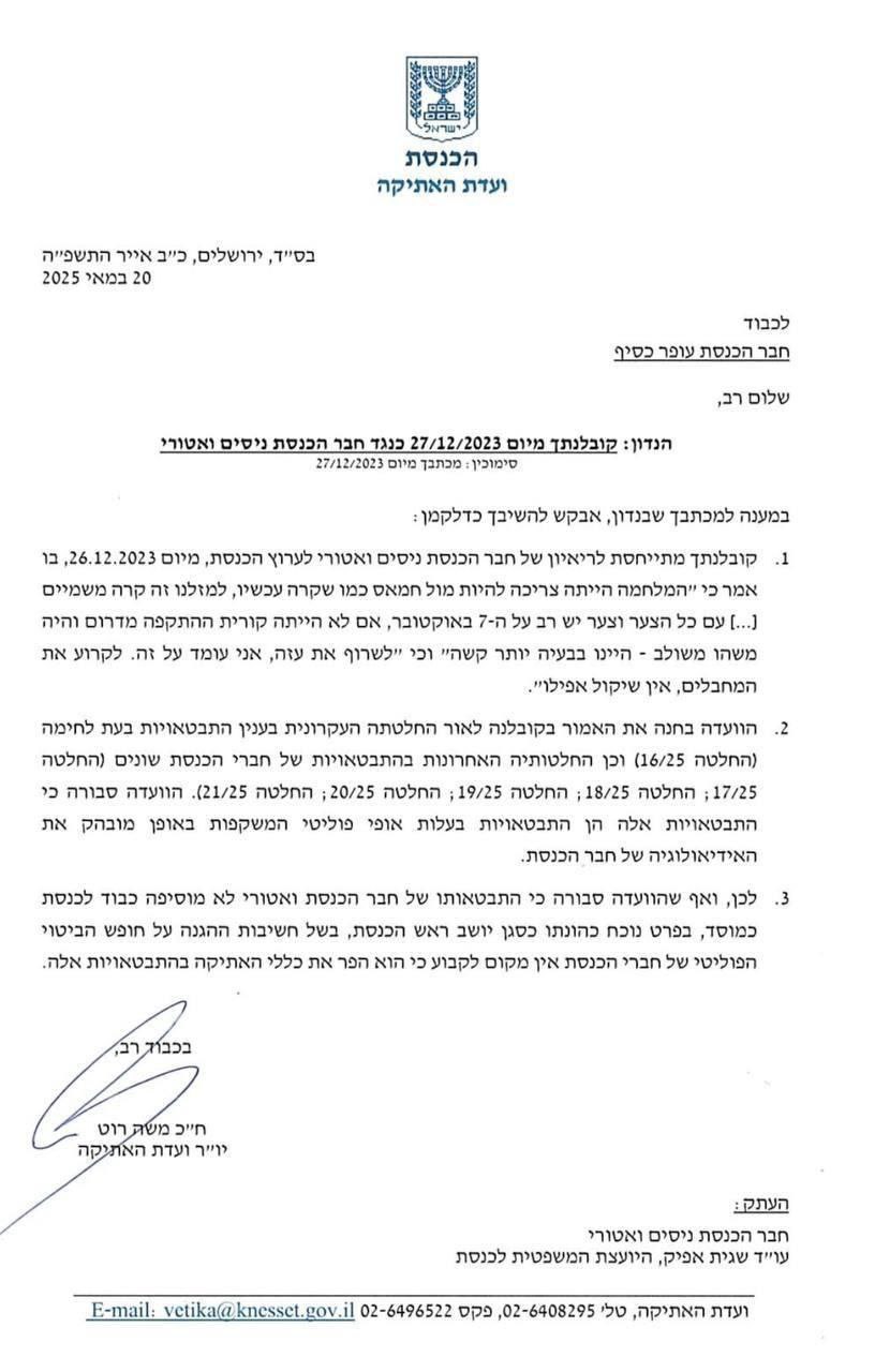 Тема: Ваша жалоба от 27.12.2023 против депутата Кнессета Нисима Ватури