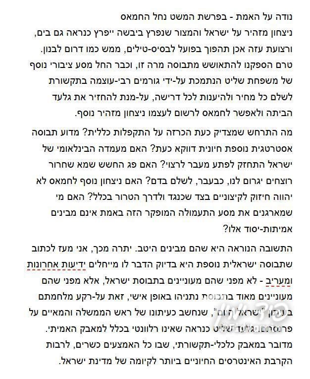 По мнению Гавишшави, тот факт, что мотивы стрелка неизвестны, не отменяет главного: вместо продвижения борьбы за Газу, он сделал идеальный подарок Биньямину Нетаньяху.