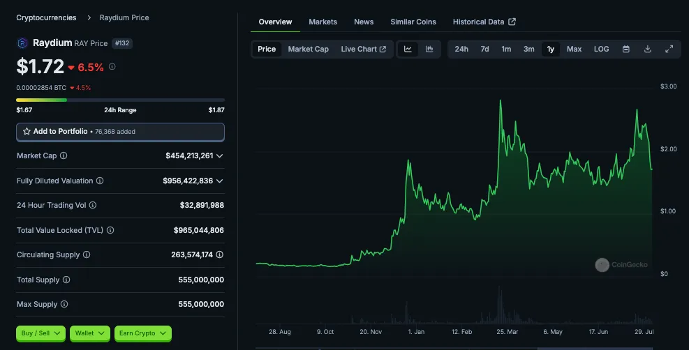 Raydium, один из лучших DEX на Solana, упал на 30% за последнюю неделю из-за падения BTC, но все же вырос на 17% за последние 30 дней.