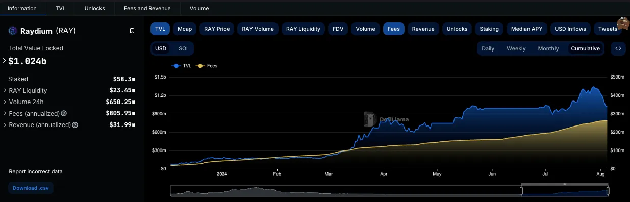 С ростом объемов торгов на Solana активность Raydium, общие комиссии и TVL резко возросли.