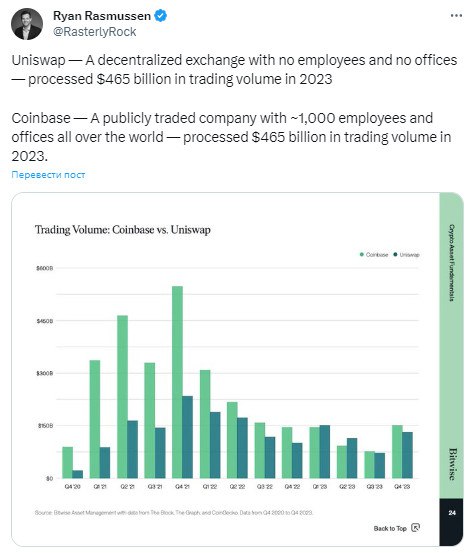 Uniswap — децентрализованная биржа без сотрудников и офисов — в 2023 году обработала торговый объем на сумму 465 миллиардов долларов.