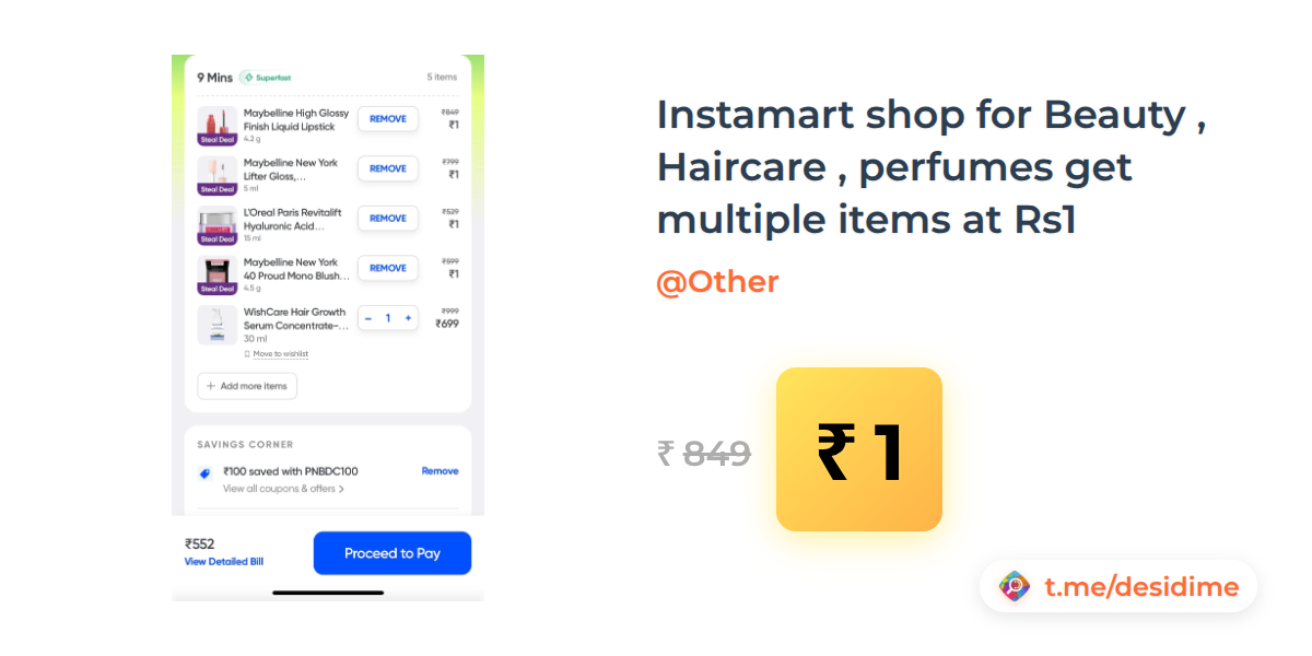 100% off on - Instamart shop for Beauty , Haircare , perfumes get multiple items at Rs1 - Rs. 1