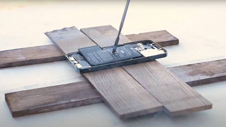 Специалисты iFixit продемонстрировали это на примере iPhone 12 Pro Max. В первом эксперименте устройство разрядили и удар металлической лопаткой по батареи спровоцировал небольшие искры и дым. Опыт повторили с полностью заряженным аккумулятором, что вызвало возгорание, которое в помещение могло вылиться в пожар.