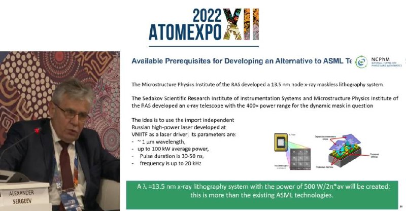 Российскую альтернативу рентгеновскому литографу ASML академик Сергеев предлагает разработать на основе трех отечественных достижений. Первое - планируется создать лазер, который будет иметь большую среднюю мощность, чем CO2-аналог, также предполагается использовать отличное от олова рабочее тело, которое, как сообщил Сергеев, разрабатывается РФЯЦ-ВНИИЭФ. Для фокусировки излучения будут использоваться рентгеновские зеркала, разработанные в Институте прикладной физики РАН и Федеральном ядерном центре в Сарове.