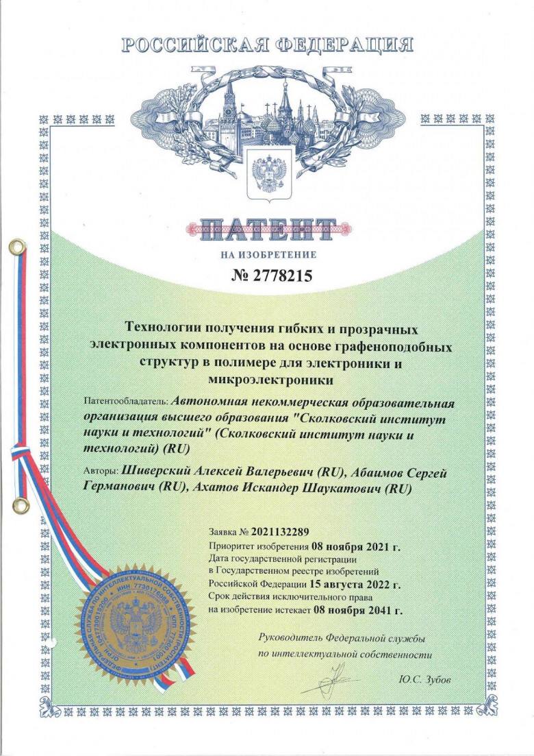 Исследователи «Сколтеха» запатентовали метод синтеза графеновых структур, при помощи которого можно создавать функциональные графеновые компоненты произвольной формы со 100-нм разрешением на гибкой прозрачной подложке для изделий гибкой и прозрачной электроники. Благодаря предложенному подходу удаётся избежать образования дефектов, возникающих в общепринятом на сегодня технологическом процессе переноса графена между подложками и приводящими к снижению качества.