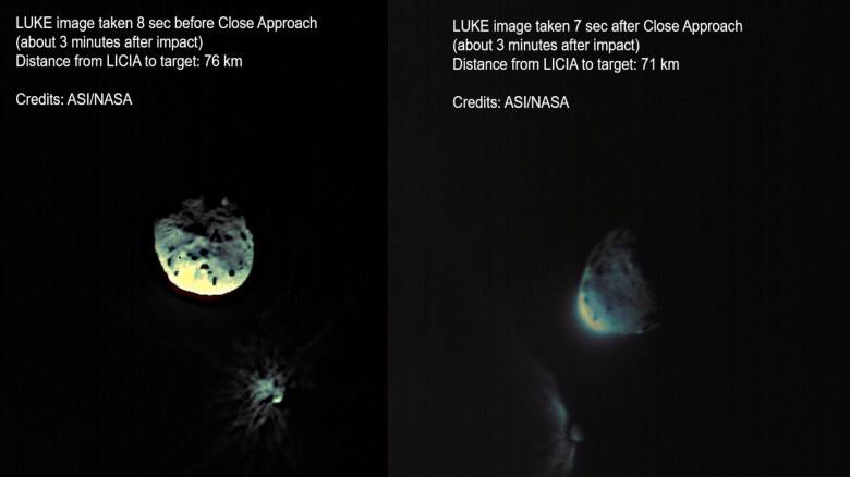 Спустя почти три месяца после столкновения космического аппарата DART с астероидом Диморф в НАСА продолжают изучать его последствия. Как выяснилось, аппарату удалось не только существенно сократить орбиту Диморфа вокруг его компаньона Дидима, но и выбить из астероида необычайное количество породы — от 1000 до 10 000 тонн.
