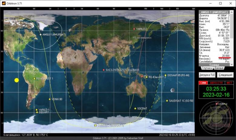 Наноспутник AMGU-1 (AMURSAT), созданный студентами Амурского государственного университета, совершил свой 20000-й облёт Земли. На юбилейный виток космический аппарат зашёл 16 февраля в 3:25 по амурскому времени.