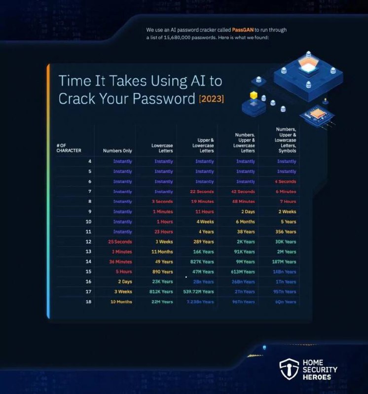 Фирма по кибербезопасности Home Security Heroes опубликовала исследование, в котором показали работу инструмента на основе искусственного интеллекта PassGAN для проверки более 15 680 000 паролей. Они смогли подобрать 51% распространённых паролей менее чем за минуту.