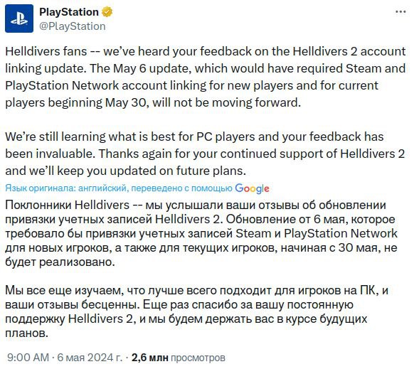 3 мая Sony объявила, что для игры в Helldivers 2 на ПК потребуется обязательная привязка к аккаунту PlayStation Network. Там заявили, что это повысит безопасность и позволит блокировать нарушителей.Игроки начали массово критиковать действия Sony, а отзывы Helldivers 2 в Steam упали сначала до «смешанных», а потом — до «в основном отрицательных».