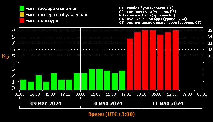 К Земле пришли наиболее скоростные массы, выброшенные Солнцем. Магнитная буря проходит через пик. Колебания поля вернулись к экстремальным значениям 5 уровня (экстремально сильная буря). Скорость солнечного ветра варьируется в диапазоне от 800 до 1000 км/с. Территорию РФ накрывает ещё более мощная полоса полярных сияний. Возможно опускание овала до южных границ страны.