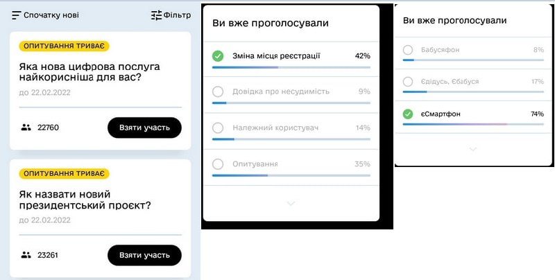 За дві години у президентському опитування в «Дії» проголосувало трохи більше 20 000 українців. У додатку з’явилася нова функція «Опитування». Глава держави задав громадянам два питання: «Яка нова цифрова послуга найкорисніша для вас? та «Як назвати новий президентський проєкт?». У другому питанні мова йде про роздачу смартфонів людям старше 60 років. Поки що відповідь на перше питання — «Зміна місця реєстрації» набирає найбільшу кількість голосів 42%, а на друге питання — «єСмартфон»(74%).