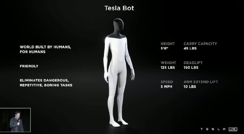 Як заявив Ілон Маск, компанія Tesla 30 вересня покаже прототип робочого робота-гуманоїда Optimus (Tesla Bot). Optimus — робот розміром з людину, що зможе виконувати повсякденні завдання, наприклад, купувати продукти. За словами Маска, гуманоїд Tesla Bot матиме «потенціал з часом стати більш значущим, ніж автомобільний бізнес». Optimus матиме зріст близько 173 сантиметрів, важитиме 57 кілограм і матиме вантажопідйомність 20 кілограм. Андроїд буде керуватися тими ж системами штучного інтелекту, які Tesla розробляє для використання в електрокарах. Подробиці — тут.