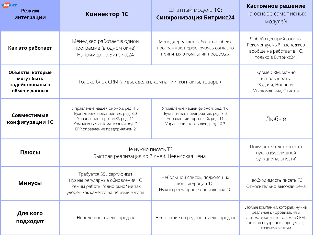 Эксперты “Авиант” подготовили памятку, чтобы вам было легче определиться. Мы проанализировали все варианты и создали шпаргалку, которая поможет выбрать оптимальный способ интеграции.