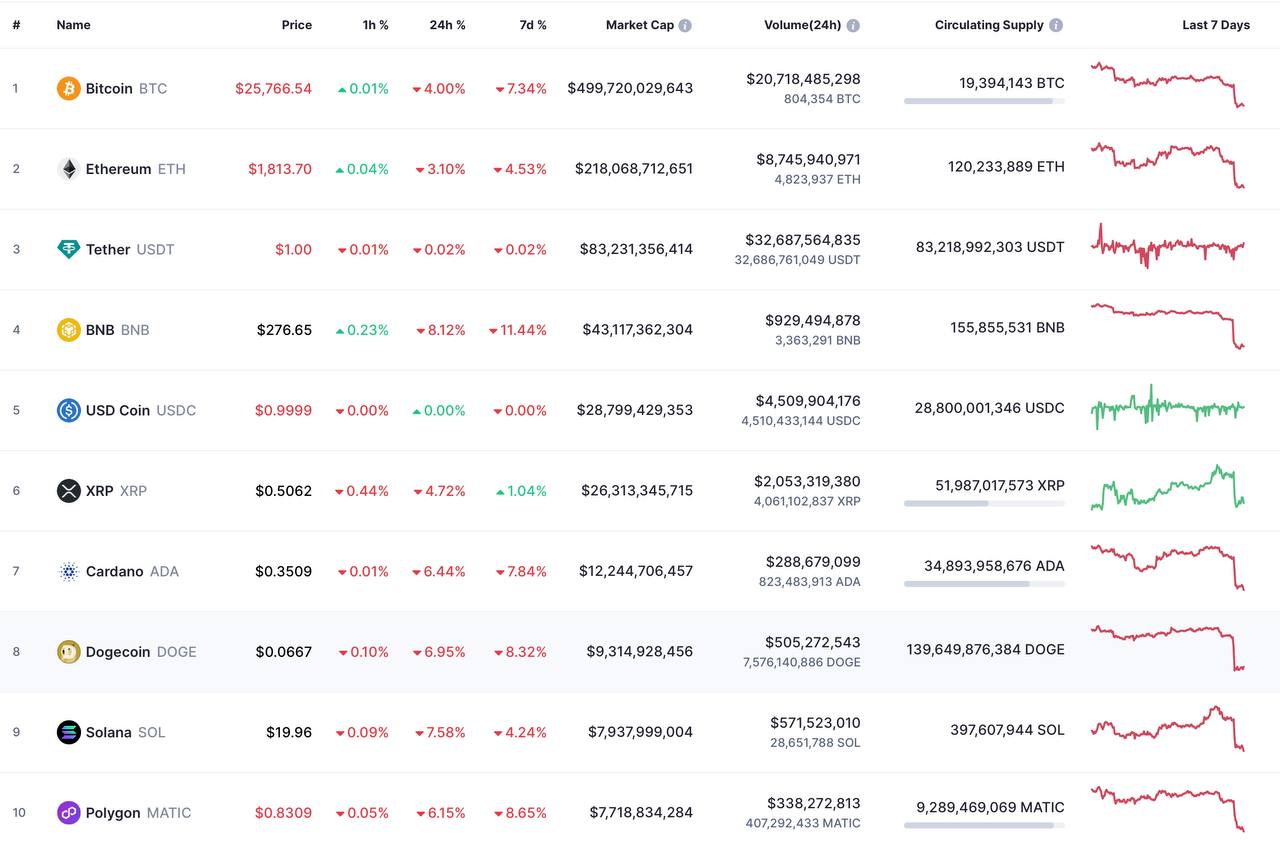 Биткоин (BTC) к этому часу стоит 25767 доллара, а эфир (ETH) 1813 доллара.
