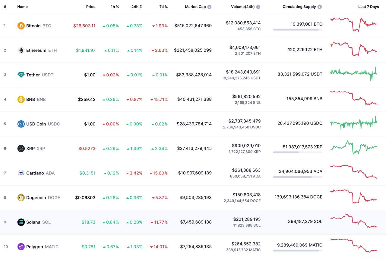 К этому часу биткоин (ВТС) слегка подорожал до $26604, а эфир (ЕТН) — до $1842.