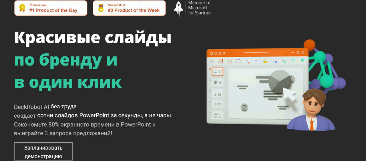 Как это работает: загружаете слайды, ИИ выравнивает объекты (текстовые блоки, графики, таблицы, изображения) по корпоративному шаблону клиента, а также изучает его фирменный стиль: палитры, шрифты, логотипы создаются, исходя из брендбука компании. ИИ предлагает несколько вариантов визуализации данных пользователя на слайде, которые человек может выбрать в один клик. "Прикрутить" программный модуль DeckRobot можно к любой из офисных программ — Excel, Outlook или Word.